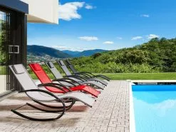 Ten nowoczesny leżak jest świetnym dodatkiem do ogrodu, na taras czy balkon. Wyposażony w materiałowe siedzisko z mocowanym na rzepy zagłówkiem i stalowe płozy, umożliwiające delikatne bujanie, jest idealnym miejscem na popołudniową drzemkę. Malowana proszkowo rama chroni przed rdzą, dzięki czemu leżanka ogrodowa będzie służyć przez długi czas.