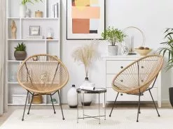 Ten zestaw dwóch krzeseł inspirowanych stylem meksykańskim zarówno do wnętrza, jak i na taras lub ogród. Obszerne, okrągłe siedzisko wykonane jest z wytrzymałego, syntetycznego rattanu, który wspaniale komponuje się z czarną, metalową ramą. Wygodne, a zarazem stabilne krzesło sprawdzi się w każdej nowoczesnej i tradycyjnej aranżacji.