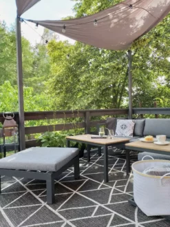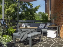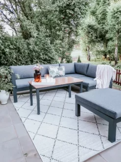 Te meble ogrodowe to połączenie nowoczesnego designu, ciekawych kolorów oraz praktycznego zastosowania. Zestaw oferuje miejsce dla 5 osób i różnorodne możliwości ustawienia i aranżacji. Stelaż wykonany został z czarnego, bardzo wytrzymałego aluminium. Części modułowe posiadają wygodne oparcia oraz podłokietniki. Elementy zestawu można tak ustawić, aby powstała przytulna narożna sofa, ale istnieje również możliwość ułożenia mebli jako osobne elementy. Dołączone do zestawu wygodne poduszki nadają meblowi miękkości i stylu.