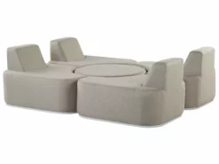 Ten minimalistyczny zestaw ogrodowy, składający się z czterech foteli i otomany świetnie sprawdzi się w każdej nowoczesnej aranżacji. Tapicerowany wysokiej jakości poliestrowym obiciem, odpornym na promieniowanie UV, jest przystosowany do użytku zewnętrznego. W zależności od potrzeb fotele można zestawić razem i stworzyć dwie wygodne sofy dwuosobowe bądź łóżko ogrodowe. Okrągła otomana może służyć jako dodatkowe miejsce do siedzenia, podnóżek lub stolik.