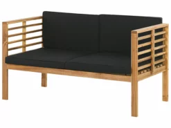 Zestaw mebli ogrodowych został wykonany z solidnego i wytrzymałego drewna akacjowego. W skład kompletu wchodzą dwa wygodne krzesła ogrodowe z wysokimi podłokietnikami, ławka ogrodowa z miejscem dla dwóch osób oraz stolik kawowy. Ich zaletą jest ponadczasowy design oraz ładna, otwarta forma, która zachęca do relaksu. Wygodne, idealnie pasujące poduszki posiadają zdejmowane poszewki wykonane z łatwego w pielęgnacji czarnego poliestru.