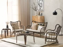 Uroczy zestaw mebli ogrodowych to wszystko, czego potrzebujesz, aby stworzyć piękny, a zarazem funkcjonalny ogród. Dzięki wykonaniu w całości z naturalnego rattanu, fotele i ławka dopasują się do otoczenia pełnego kwiatów i roślin. Miękkie poduszki siedziskowe zapewniają najwyższy poziom komfortu i umożliwiają spędzanie niezliczonych godzin na wypoczynku. Nie zapomnij o przekąskach, które możesz bezpiecznie trzymać na mniejszym stoliku pomocniczym, lub szerokim stoliku kawowym.