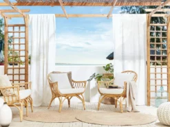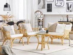 Ten ręcznie robiony zestaw, wykonany z wysokiej jakości rattanu, doskonale sprawdzi się w każdym wnętrzu, jak i na tarasie lub balkonie. Wyjątkowy splot rattanu, inspirowany formami vintage, sprawia, że ten komplet idealnie komponuje się z aranżacjami w stylu boho, retro czy eklektycznym. Sofa i fotele posiadają grube poduszki w zdejmowanych poszewkach ułatwiających czyszczenie. Okrągły stolik kawowy posiada praktyczną półkę i blat ze szkła hartowanego zabezpieczony przyssawkami.