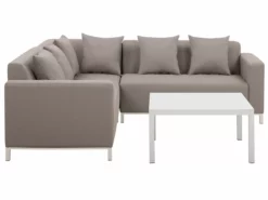 Uczyń swój ogród miejscem do odpoczynku czy spotkań i wzbogać go o ten zestaw. Zbudowana z modułów, które można ustawiać według własnych potrzeb, dodając funkcjonalności sofie. Cała konstrukcja tapicerowana jest poliestrem w brązowoszarym kolorze, który charakteryzuje się dużą odpornością na promienie UV, dzięki czemu mebel nie traci swojego wyjątkowego koloru. Wypełniony specjalną pianką Quick Dry, mebel wytrzymuje też zmienne warunki pogodowe i opady deszczu. Do kompletu dołączony jest również stolik kawowy, wykonany z trwałego i łatwego w utrzymaniu aluminium, a także dodatkowe poduszki w pasującym do sofy kolorze. Dzięki swojemu nowoczesnemu i minimalistycznemu designowi ten zestaw sprawdzi się w każdym ogrodzie.