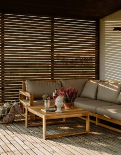 Ten praktyczny zestaw ogrodowy swój elegancki, a zarazem nowoczesny wygląd zawdzięcza niezwykle prostemu designowi. Mebel wykonany został z wytrzymałego, prostego w pielęgnacji drewna akacjowego z certyfikatem. Narożnik złożony jest z elementów modułowych, które mogą być aranżowane na różne sposoby lub posłużyć jako osobne siedziska. Zestaw ogrodowy zachwyca doskonałą kombinacją kolorów – ciepłego brązu drewna ze szlachetnych szaro-beżowym kolorem miękko tapicerowanych poduszek.