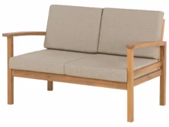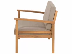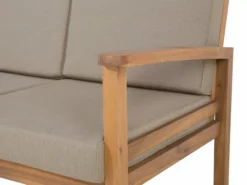 Ten nowoczesny zestaw mebli ogrodowych to elegancki i bardzo stylowy element wystroju każdego ogrodu. Komplet składa się z niskiego, prostokątnego stolika kawowego, szerokiej ławki, dwóch wygodnych foteli, oraz praktycznego podnóżka, który może być wykorzystany jako dodatkowe siedzisko bądź stolik. Meble zostały wykonane z jasnego, drewna akacjowego z certyfikatem. Poduszki znajdujące się na siedziskach zwiększają komfort korzystania z mebla, a ich powłoczki wykonano z wytrzymałego, brązowoszarego poliestru.