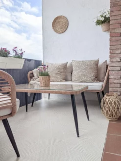 Zestaw mebli zewnętrznych, który doda Twojemu ogrodowi nieco rustykalnego stylu. Składa się z sofy, dwóch foteli i stolika do kawy – wygodnie pomieści do 4 osób. Meble wykonane są z wysokiej jakości rattanu oraz posiadają grube, wygodne poduszki. Z tym zestawem stworzysz idealne miejsce do odpoczynku z rodziną i spędzania kameralnych wieczorów z przyjaciółmi.