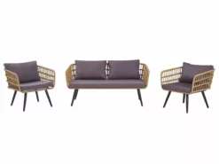 Wprowadź rustykalny klimat do swojego ogrodu zestawem wypoczynkowym. Składa się z dwuosobowej sofy i dwóch foteli, wykonanych z wytrzymałego technorattanu, ze stabilnymi stalowymi nogami, które zapewniają wygodne miejsce do relaksu dla czterech osób. Grube szare poduszki siedziskowe i oparciowe nie tylko zapewniają maksymalny komfort, ale także dodają zestawowi elegancji. Stolik kawowy z blatem ze szkła hartowanego oferuje dużo miejsca do serwowania późnych porannych śniadań, popołudniowych przekąsek czy wieczornych drinków.