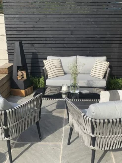Perfekcyjny komplet do wypoczynku na tarasie, bądź w ogrodzie. Odporne na warunki pogodowe sofa i fotele mieszczą do 4 osób, a praktyczny prostokątny stół może służyć jako miejsce na napoje i przekąski. Szary splot rattanowy jest wytrzymały i niezwykle ozdobny – nadaje zestawowi rustykalnego charakteru.