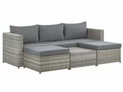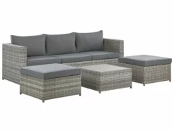 Ten funkcjonalny zestaw wypoczynkowy doskonale uzupełni każdą przestrzeń zewnętrzną. W zestawie są 4 części, które można łączyć lub stawiać osobno. Sofa trzyosobowa ma podnoszone siedzisko po obu stronach, dzięki czemu może służyć jako leżanka. Z dołączonymi podnóżkami możesz stworzyć sofę narożną. Stolik kawowy ma wystarczająco dużo miejsca, aby cieszyć się lunchem na świeżym powietrzu. Zestaw wykonany jest z trwałego sztucznego rattanu o czesanym splocie i wyposażony w grube poduszki zapewniające wygodę.