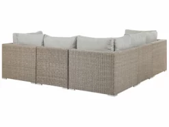 Przedstawiony zestaw mebli tworzy wspaniałą atmosferę w każdym ogrodzie i zapewnia wystarczająco miejsca dla sześciu osób. Modułowy narożnik, fotel oraz stolik kawowy wykonane są z technorattanu, a poszczególne moduły można ze sobą zsunąć bądź ustawić osobno, co sprawia, że zestaw jest wyjątkowo funkcjonalny. Te meble ogrodowe z brązowoszarego technorattanu odznaczają się wysoką jakością, szczególną odpornością na warunki pogodowe i promieniowanie UV. Miękkie poduszki dołączone do zestawu są odporne na wilgoć i zabrudzenia.