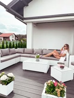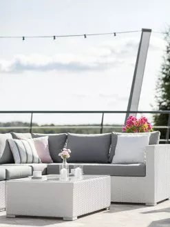 Usiądź wygodnie we wspaniale szerokim fotelu lub na narożniku, który składa się z trzyosobowej sofy z podłokietnikami, dwuosobowej sofy narożnej oraz dwóch modułów bez podłokietników. Wszechstronność tego zestawu polega na elementach, które można połączyć w całość, tworząc wspaniały zestaw mebli narożnych bądź ustawić je osobno. Dwa stoliki kawowe wyposażone są w przezroczysty blat wykonany z hartowanego szkła z zaokrąglonymi krawędziami. Meble ogrodowe wykonane z technorattanu odznaczają się wysoką jakością, szczególną odpornością na warunki pogodowe i długą żywotnością. Wytrzymały stelaż wykonany z powlekanego aluminium gwarantuje stabilność konstrukcji.