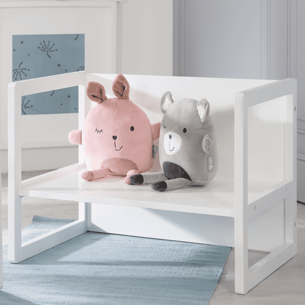Ławka roba może być jednocześnie stołem. Ławka może zostać zamieniona w stół w mgnieniu oka. Może być regulowana pod względem wysokości: 18 cm lub 27,5 cm. Wykonana z płyty MDF, pomalowana na biało, ze stylowym frezowaniem. Produkt jest lekki i wytrzymały, dzięki czemu dzieci mogą łatwo i bezpiecznie obchodzić się z meblami. Nie ma żadnych ostrych krawędzi ani punktów mocowania, które mogłyby zranić dziecko. Ławka i stół mogą wytrzymać obciążenia do 40 kg i mogą być używane od 12 miesiąca życia.